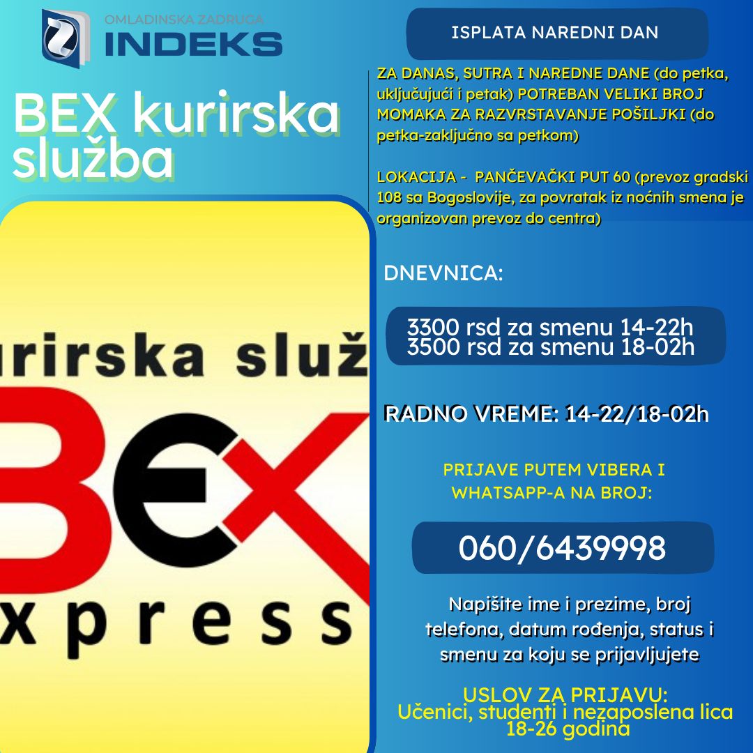 ZA DANAS, SUTRA I NAREDNE DANE POTREBNI MOMCI ZA RAD U BEX KURIRSKOJ SLUŽBI