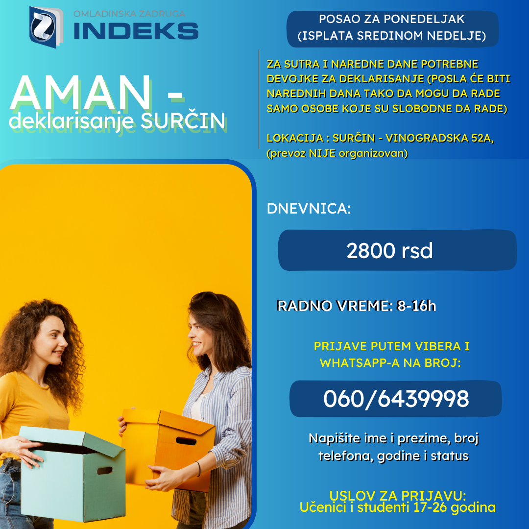 ZA SUTRA POTREBNE DEVOJKE I MOMCI ZA DEKLARISANJE ROBE U MAGACINU U NOVOJ PAZOVI